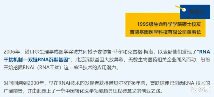 炸雷前,吉凯基因是创投圈最豪华配置公司之一,拥有“天花板级”创业团队与资本投入。公司创始人曹跃琼是复旦大学女科学家,生命科学技术最早的探路者之一。复旦大学校友会给予曹跃琼极高评价,“早在RNAi技术的发现者获得诺贝尔奖的6年前,曹跃琼便已洞悉RNAi技术的广阔前景,由此走上了一条中国转化医学领域颇具里程碑意义的创业之路。”