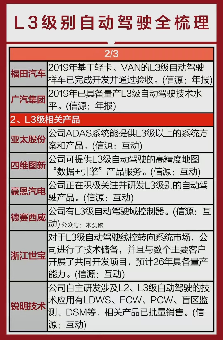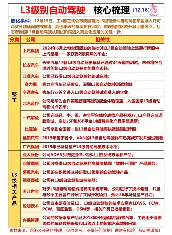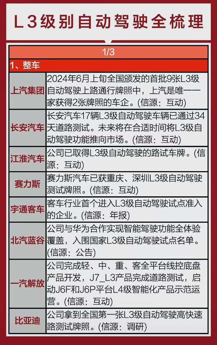 L3级自动驾驶从整车到配套,多家企业已提前布局:上汽、长安等车企拿下路试牌照或完成测试;亚太股份、四维图新等供应商也备好L3级系统、高精地图等核心产品。