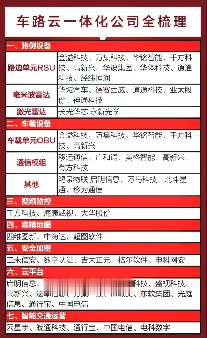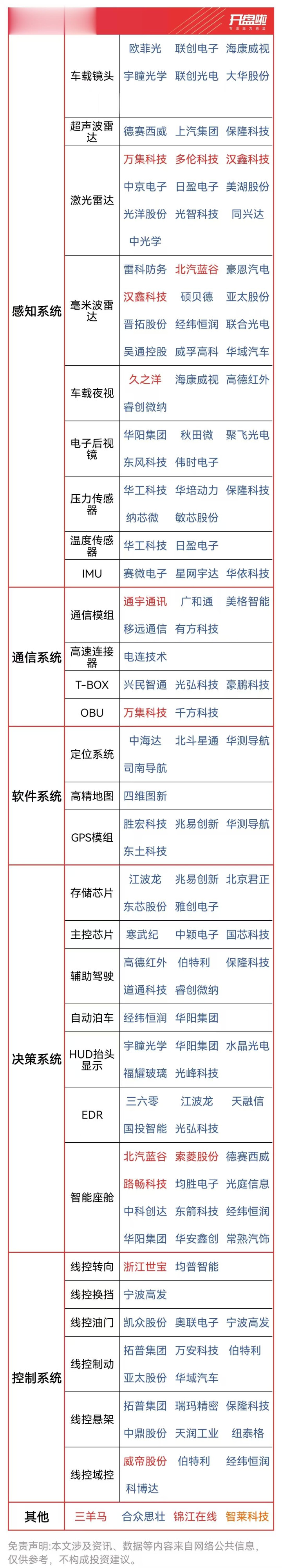 激光雷达龙头汉鑫科技、万集科技;毫米波雷达龙头雷科防务、北汽蓝谷;通信模组龙头美格智能、通宇通讯;软件系统龙头四维图新、中海达;智能座舱龙头路畅科技、均胜电子等等。